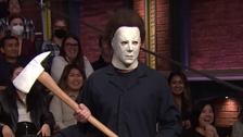 Meyers ― who launched the scary character as his “weirdo cousin” ― watched as a silent Myers strolled out onto the set with a knife in hand.