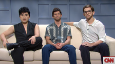 Gleeson interrupted Nwodim’s report on Russia’s escalating threats to the West by looping within the Strive Guys performed by Bowen Yang, Mikey Day and Andrew Dismukes.